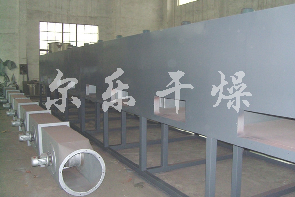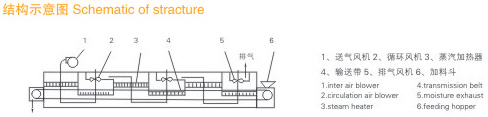 物料由加料器均勻地鋪在網(wǎng)帶上,網(wǎng)帶一般采用12-60目不銹鋼絲網(wǎng),由傳動裝置拖動在干燥機內移動。干燥機由若干單元組成,每一單元熱風單獨循環(huán),部分尾氣由專門排濕風機排出,廢氣由調節(jié)閥控制,熱氣由下往上或由上往下穿過鋪滿物料的網(wǎng)帶完成熱量與質量傳遞的進程,帶走物料水份。網(wǎng)帶緩慢移動,運行速度可根據(jù)物料溫度自由調節(jié),干燥后的成品連續(xù)落入收料器中。上下循環(huán)單元根據(jù)用戶需要可靈活配備,單元數(shù)量亦可根據(jù)需要選取。