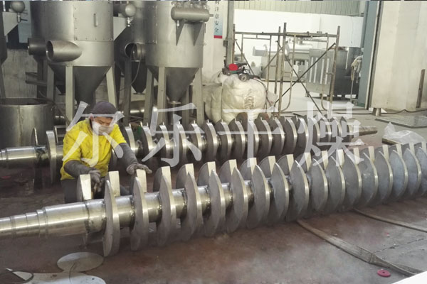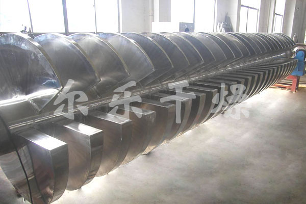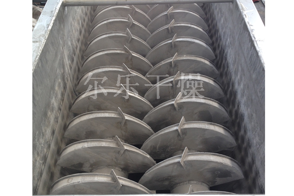 空心軸上密集排列著楔型中空漿葉,熱介質(zhì)經(jīng)空心軸流經(jīng)漿葉。單位有效容積內(nèi)傳熱面積很大,熱介質(zhì)溫度從-40℃到320℃,可以是水蒸汽,也可以是液體型:如熱水、導(dǎo)熱油等。間接傳導(dǎo)加熱,沒(méi)有攜帶空氣帶走熱量,熱量均用來(lái)加熱物料。熱量損失僅為通過(guò)器體保溫層向環(huán)境的散熱。楔型漿葉傳熱面具有自清潔功能。物料顆粒與楔型面的相對(duì)運(yùn)動(dòng)產(chǎn)生洗刷作用,能夠洗刷掉楔型面上附著物料,使運(yùn)轉(zhuǎn)中一直保持著清潔的傳熱面。漿葉干燥機(jī)的殼體為Ω型,殼體內(nèi)一般安排二到四根空心攪拌軸。殼體有密封端蓋與上蓋,防止物料粉塵外泄而充分發(fā)揮作用。
